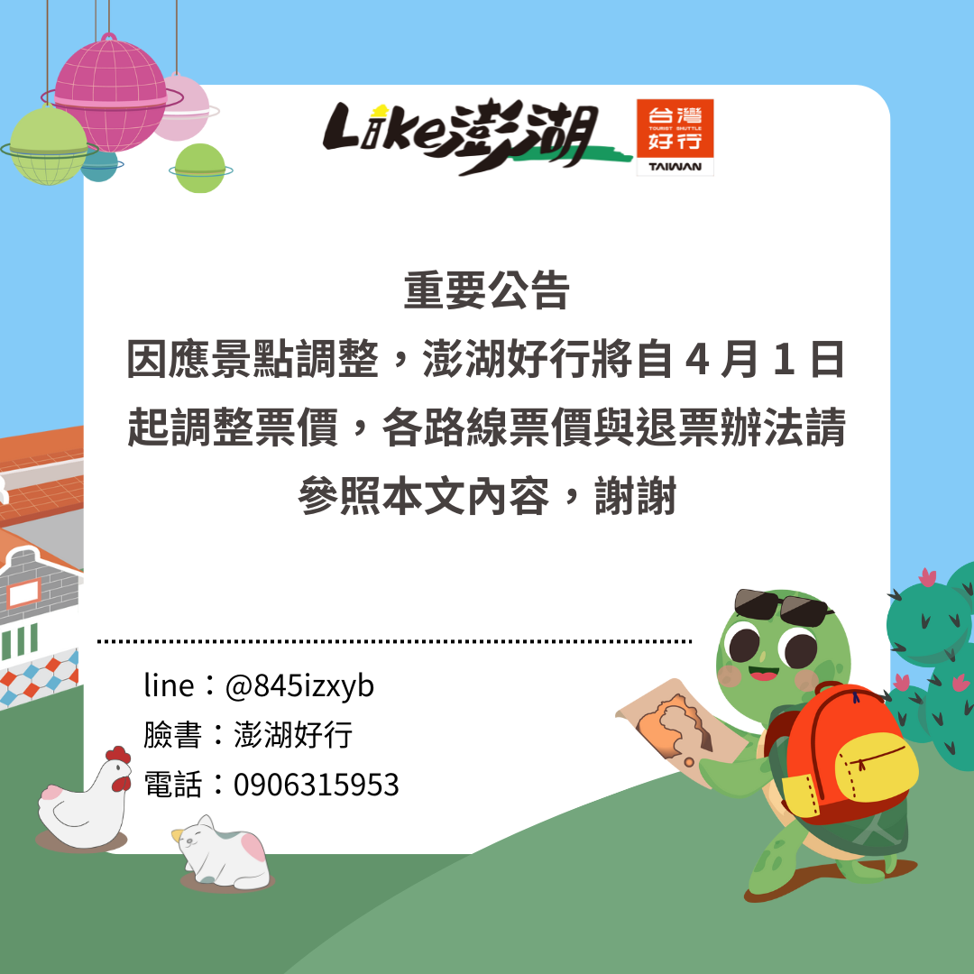 【重要公告】 114/4/1 起澎湖好行票劵價格調降