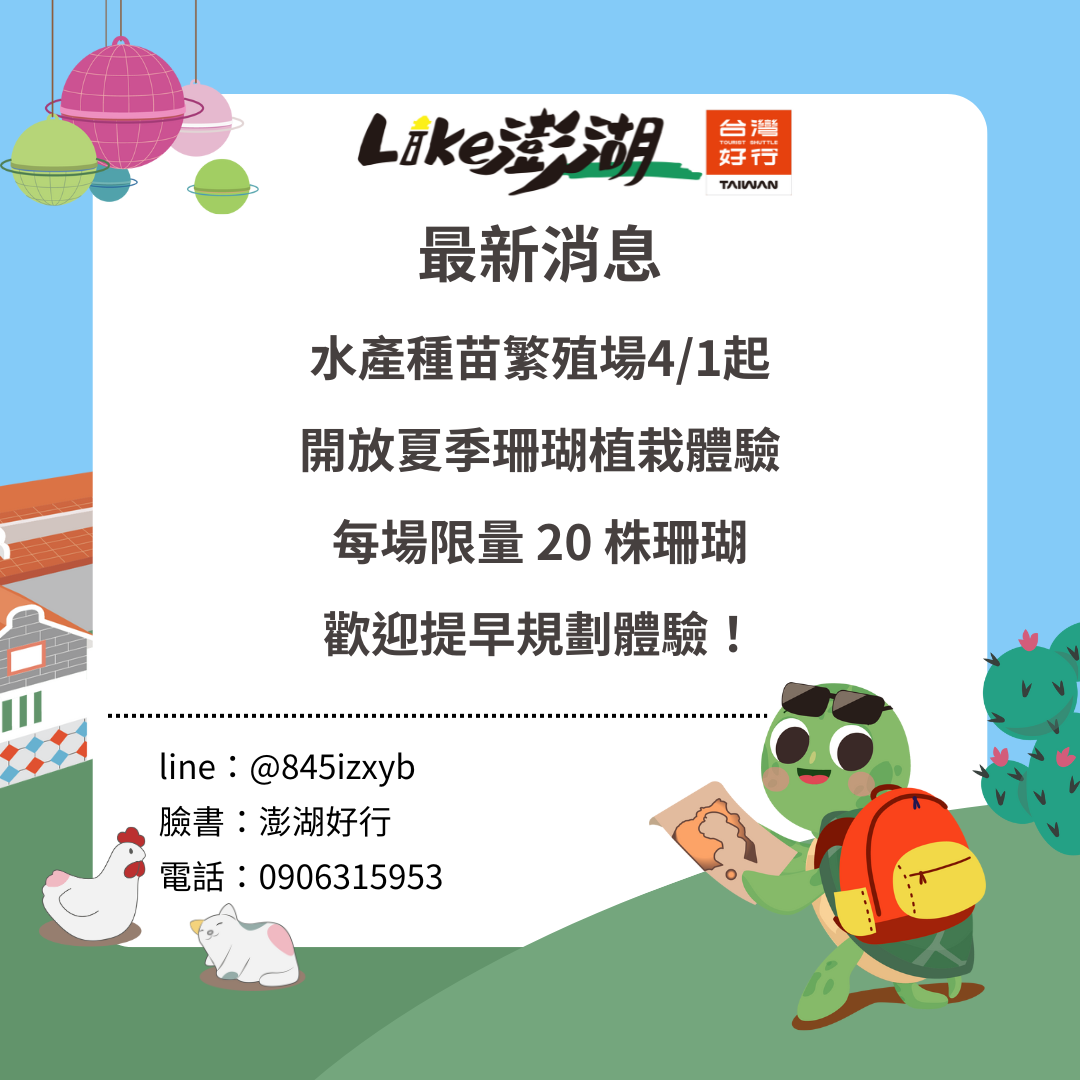 【最新消息】澎南線景點體驗「水產種苗繁殖場」體驗種植珊瑚趣將於4/1開放📢