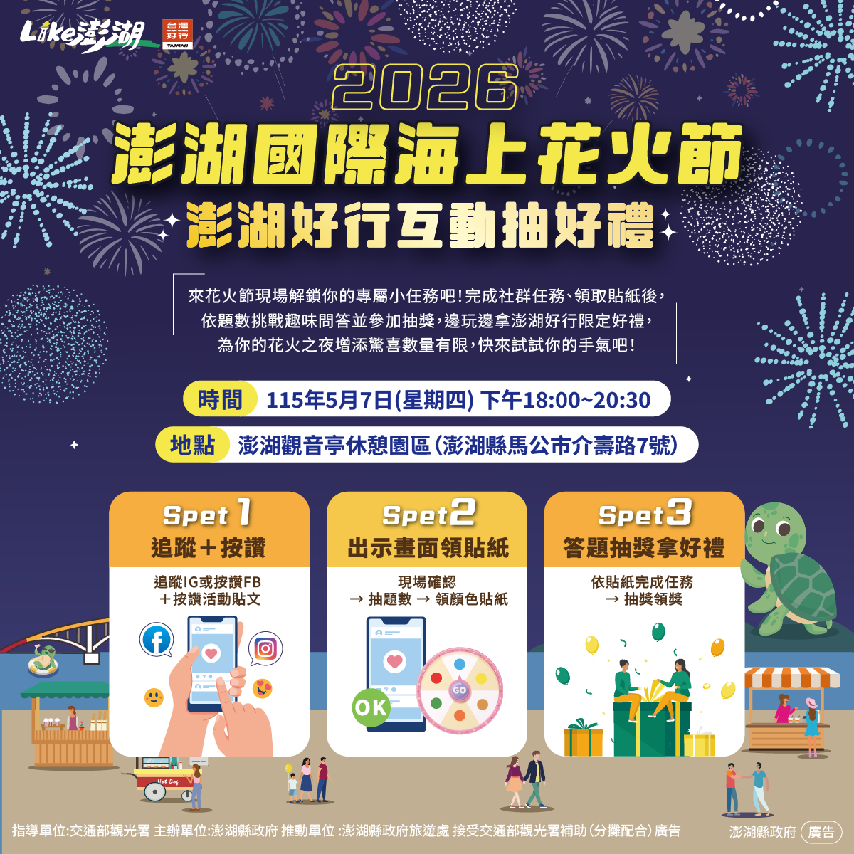 來觀音亭看煙火, 不只拍美照、看花火,還能邊玩邊抽澎湖限定小禮物! 讓澎湖好行陪你一起嗨玩花火節,我們不見不散~ • 活動地點:花火節觀音亭宣導攤位 • 活動日期:115年5月7日(星期四) • 活動時間:18:00-20:30 參加方式很簡單! ① 按讚澎湖好行FB或追蹤IG《澎湖好行》 ② 按讚本篇貼文 ③ 出示完成畫面,現場抽取題數並領取貼紙 ④ 完成互動問答,即可參加抽獎! 完成互動就有機會帶走澎湖好行精美禮品 限時一天、數量有限,送完為止! 現場採貼紙發放制,發完即停止參與 #媽宮北環線 #媽宮湖西線 #媽宮澎南線 #等你妳來搭乘 |客服專線:0906315953| |官方LINE:@845izxyb7|